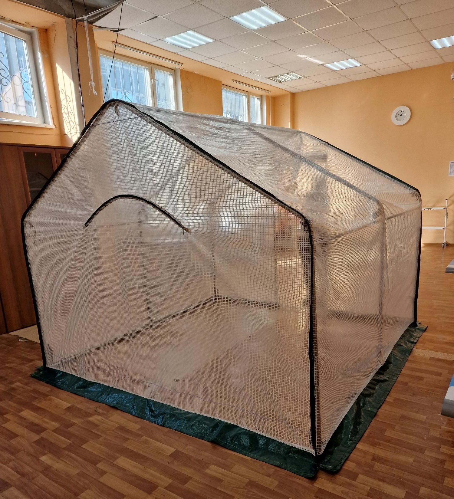 Чехол одевается поверх каркаса и крепится к нему специальными вшитыми завязками. Дверь и форточка чехла - на молнии.