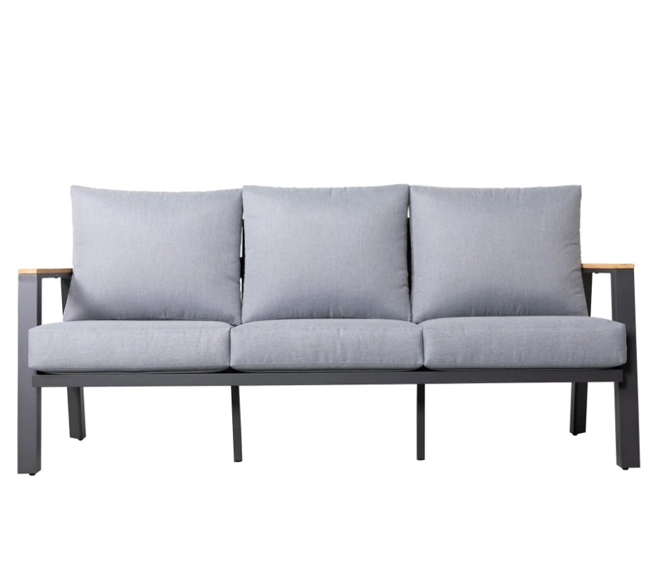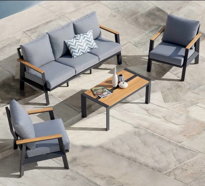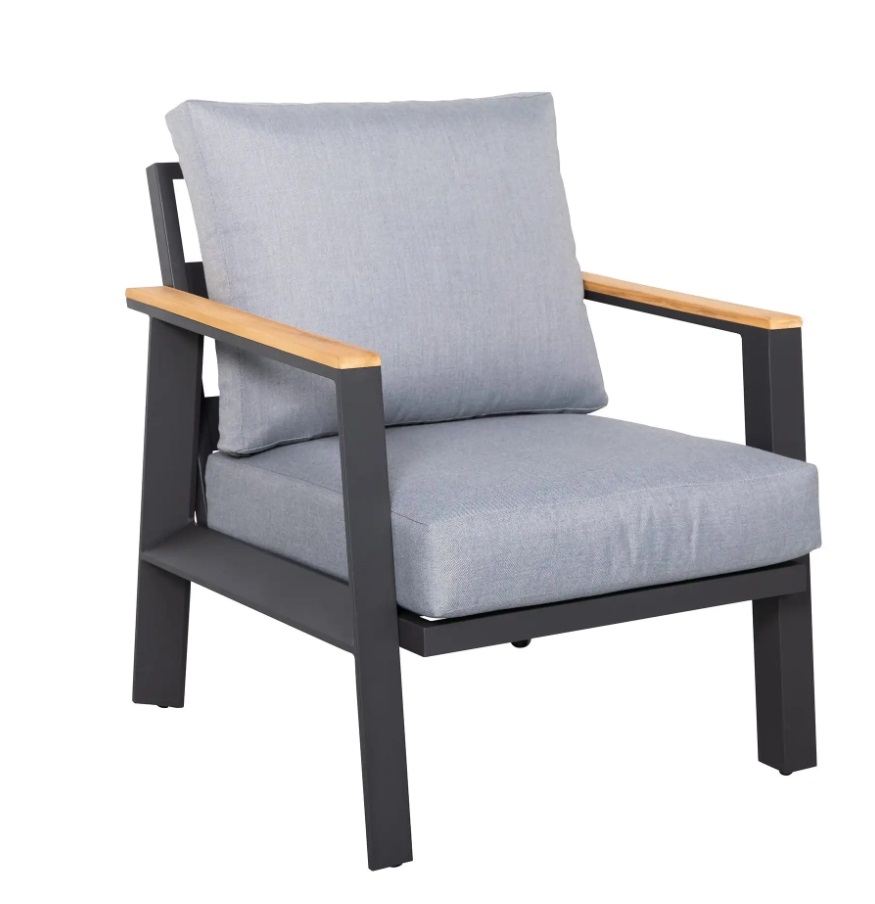 Набор Capri – это красивый, минималистичный дизайн и высокое качество мебели. Комплект садовой мебели состоит из одного просторного кресла с низкой спинкой 80x77x75,5 см и невысокого журнального столика 112х36,5х65,5 см. Вся мебель выполнена в серых тонах, каркас мебели – алюминий. Алюминиевый каркас обеспечивает конструкции прочностью, долговечностью и легкостью – переносить мебель можно в любую точку сада, и оставлять ее под открытым небом летом без страха. Кресла оснащены широкими подлокотниками, столешница прорезями для легкой уборки стола.