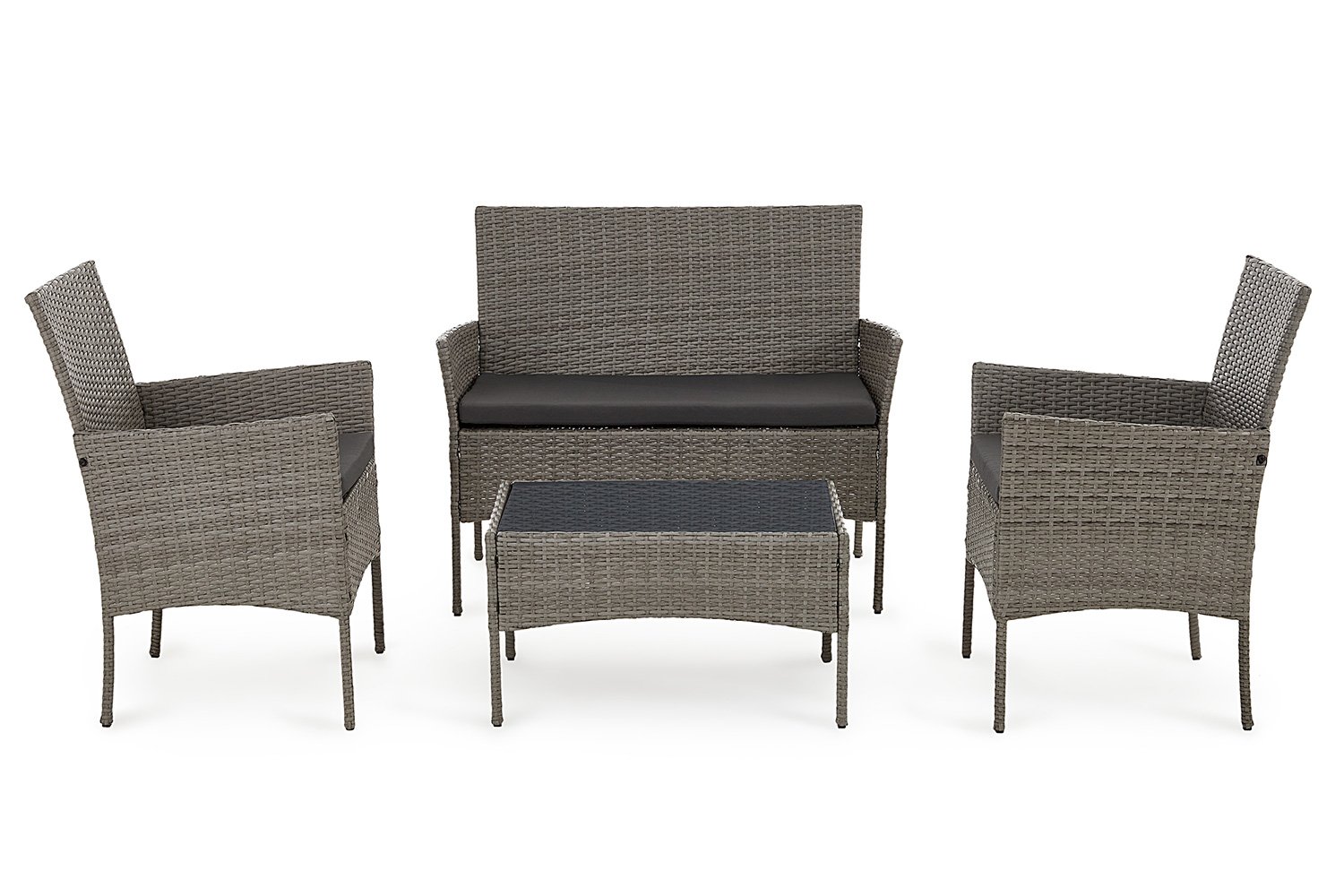 Набор садовой мебели Rio состоит из двух одноместных кресел, журнального столика и дивана (трехместного кресла). Внешний вид готового изделия: все части набора выполнены из стального каркаса, а переплетения, образующие подлокотники, спинки и боковые стороны выполнены плотным переплетением из искусственного ротанга коричне-серового цвета. Преимущества такого материала заключается в том, что он не плесневеет под воздействием воды, не размокает, не рушится и не выцветает на солнечном свете. На готовых изделиях уложены матрасы, с максимальной нагрузкой 120 кг, а на столе рабочей поверхностью является закаленное стекло, которое может выдерживать до 25 кг нагрузки.