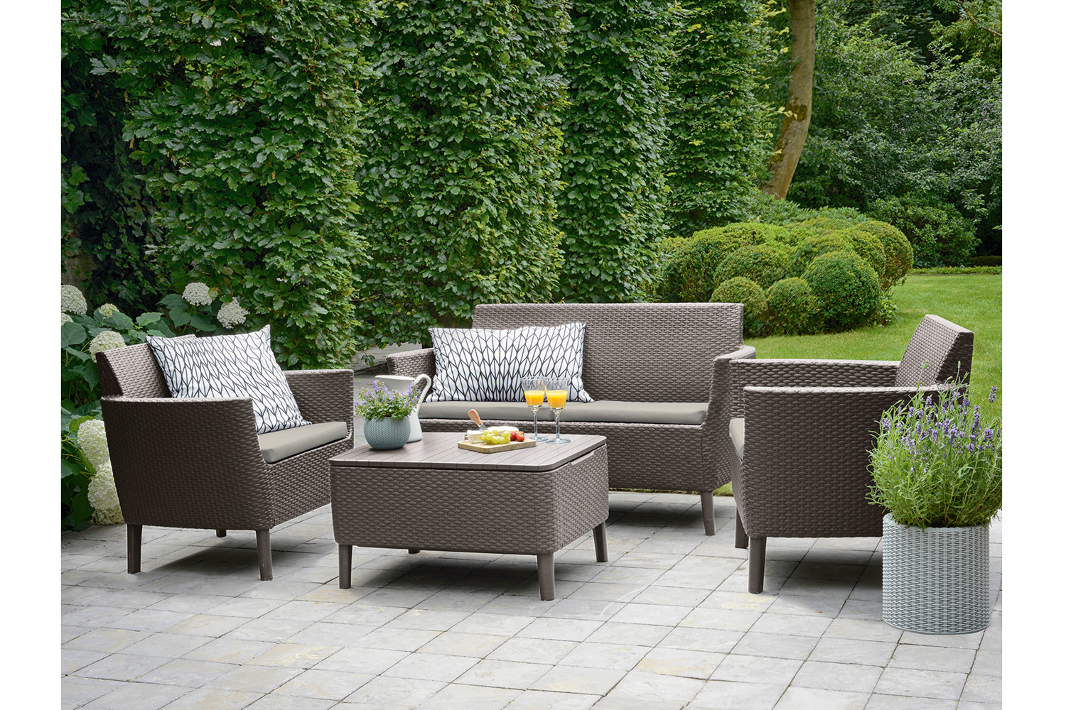 Комплект Salemo Set предназначен для отдыха на природе небольшой компании. Комплект мебели состоит из трехместного дивана 137х76х67, двух кресел 66,5x76x75 см и журнального столика 76х42х57 см. Комплект мебели включает в себя диван на трех человек, двух одноместных кресел и столика с встроенным отсеком для хранения предметов. Все части мебели выполнены в едином стиле – коричневый оттенок (капучино) оплётки, подушек и каркаса.