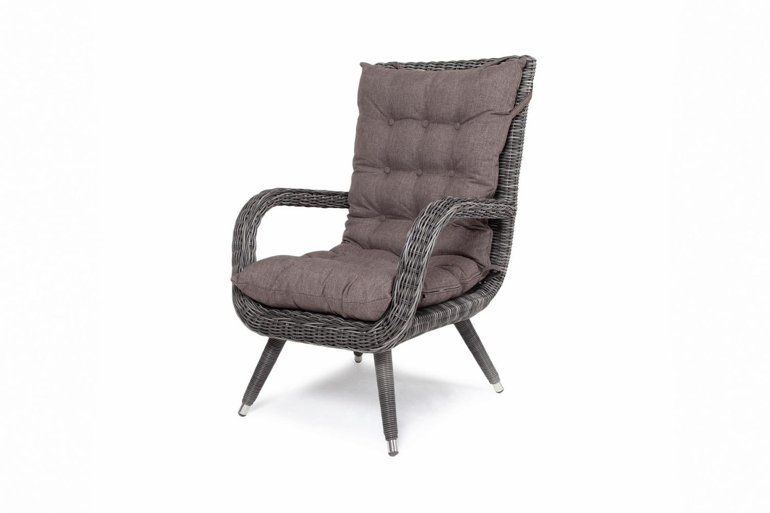 Кресло изготовлено на основе алюминиевого каркаса, который обтянут искусственным ротангом цвета графита. Такая оплетка выглядит стильно и элегантно, а также очень прочна и не требует особого ухода. Спинка кресла имеет удобную высоту, а подлокотники придают ему еще больше комфорта. Габариты Toledo составляют 81х99х69 см, что делает его идеальным для любого интерьера – будь то квартира или беседка на даче.