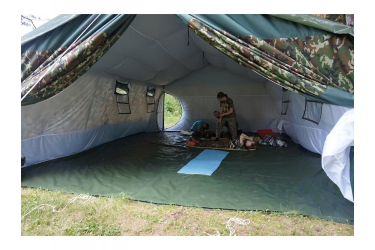 Внешняя часть палатки выполнена из прочного водонепроницаемого тентового материала – нейлона, полиэстера, ПВХ. Внутренняя часть чаще всего выполняется из нейлона. Преимущественно из оксфорда изготавливается дно палатки. Ткани обрабатываются специальным составом, что наделяет их качествами огне- и водостойкости. Швы сшиты по методу сварки горячим воздухом и тщательно проклеены. Каркас изготавливается из сплавов алюминия и пластика, который крепится к материалу палатки с помощью крючков, липучек, завязок или карманов. Дополнительно изделия снабжаются москитными сетками, тамбурами, окошками, выходом-выходом, молниями. Они имеют разную форму, размеры и цвет. .jpg)